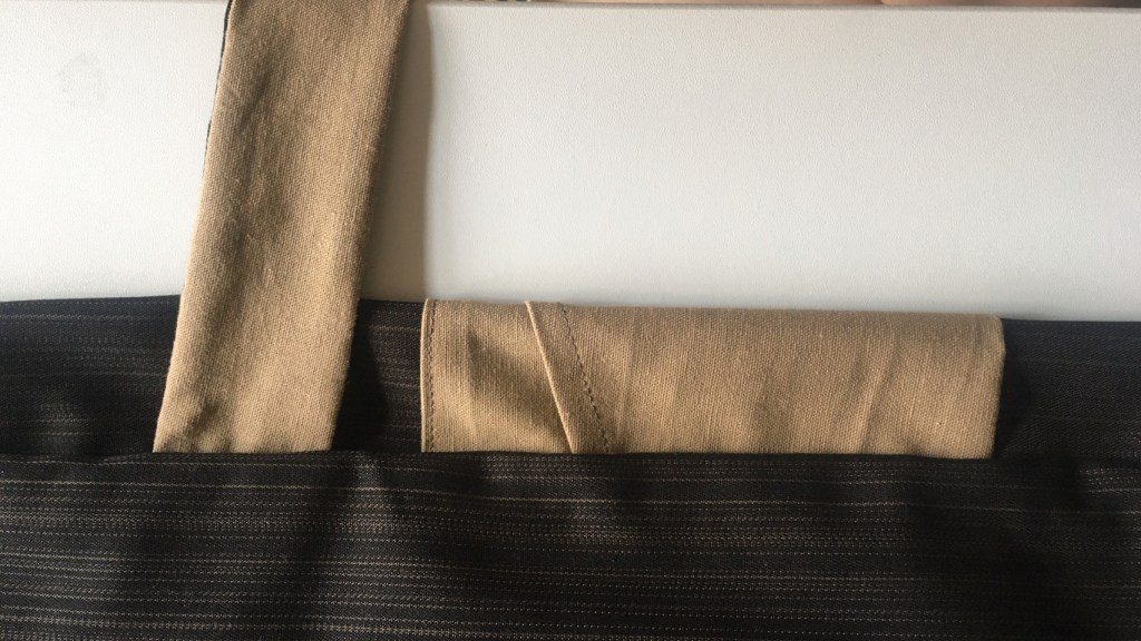 所以,這次直接把口袋加上去。加縫的位置在右前片,從肩線往下約40cm的內側,使用淺咖啡色的棉麻布,大小是可以放入一支 iphone6s 的。口袋的斜角開口原本要做正三角形,但那樣一點也不好放東西,所以改成開口更朝上、細長的三角形開口。