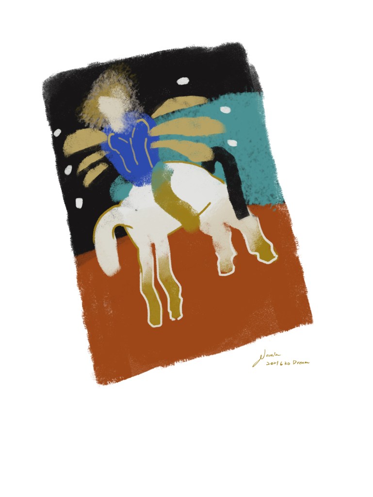 醒來回想一整段夢,會覺得真是莫名其妙,但在夢裡面一切都很合理。在夢裡看得很清楚的東西,醒來只剩下一片模糊和感覺,畫出很細的物件和狀態對我來說很困難,但能畫出感覺到的、模糊的東西,也夠有趣了😁
