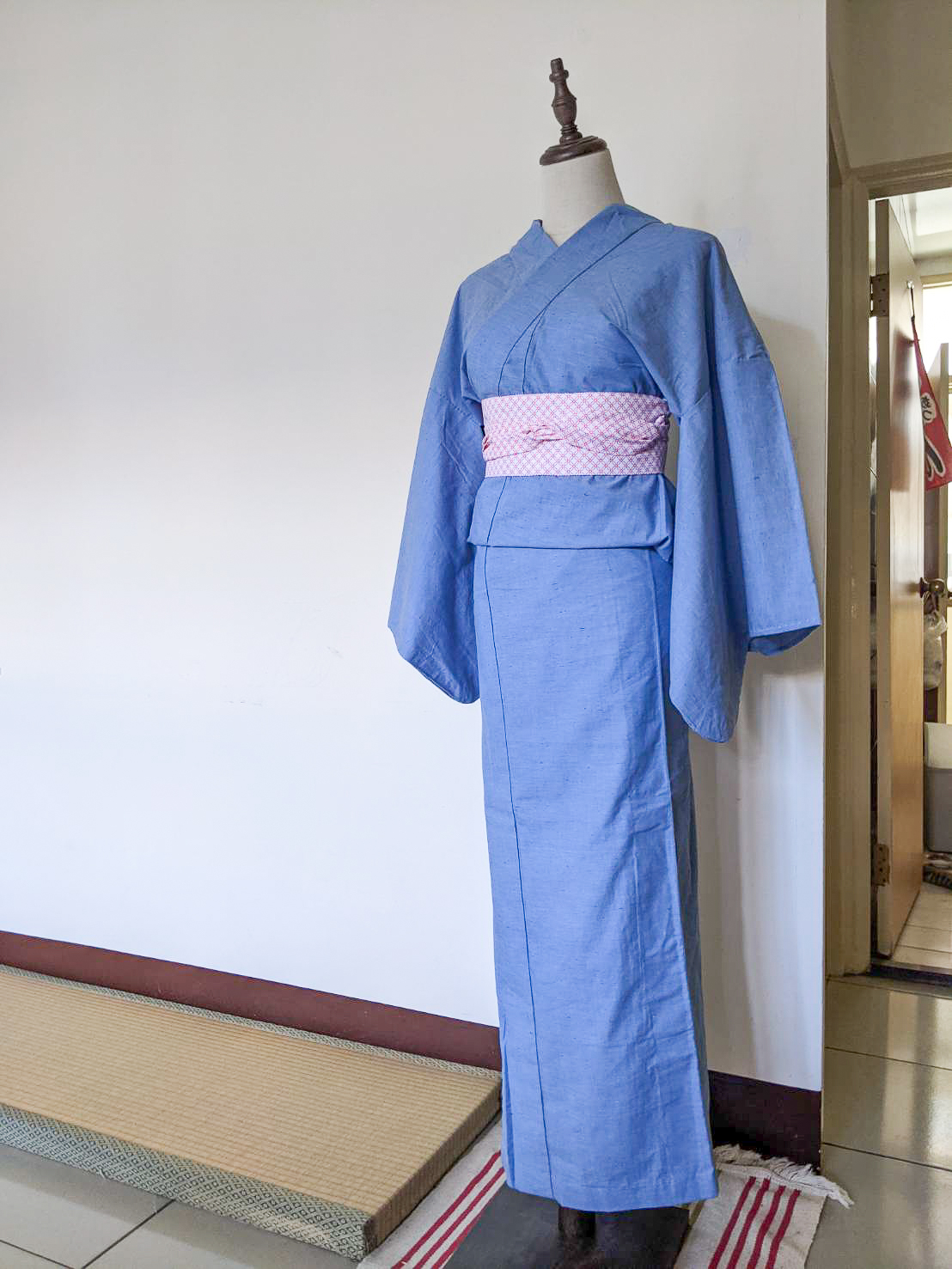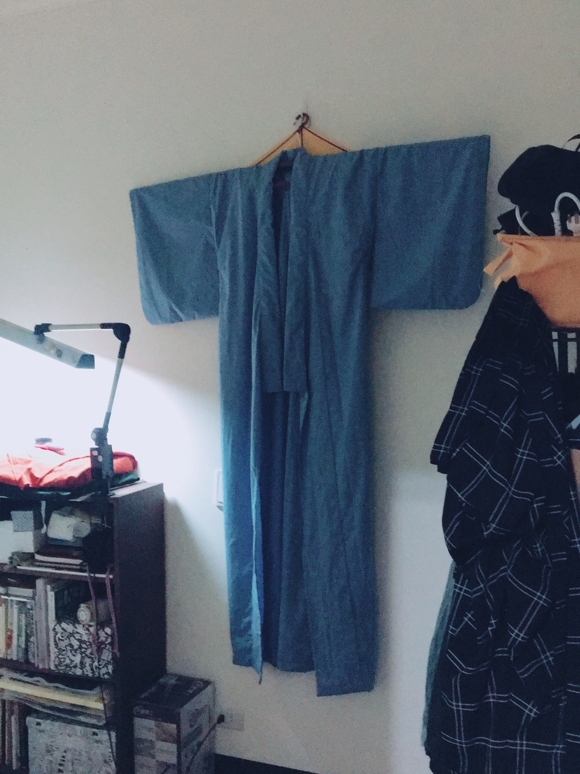 第一件浴衣從裁減布料到做完大概花了兩個月,基本上一周大約有兩到四天晚上會研究,有時候一整個晚上只縫了一條線,大約100多公分而已。做這件浴衣的每一天,我都在懷疑人生,看著一坨完全不知道到底是甚麼狀況的醬菜,開始慢慢覺得不管有沒有做對我只要做完就好。過了一年多做了第二件浴衣,從洗布到完成約四天,浴衣的部分大致上不太需要回頭翻書,跟第一件對比,超有成就感 XD