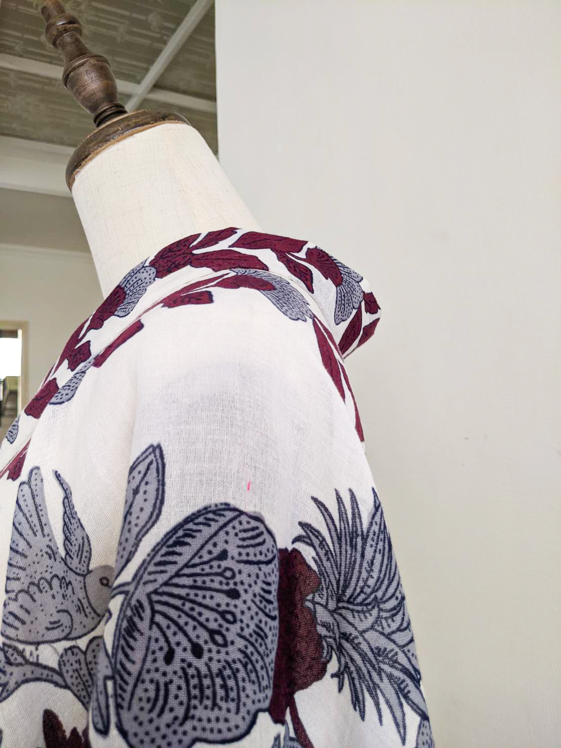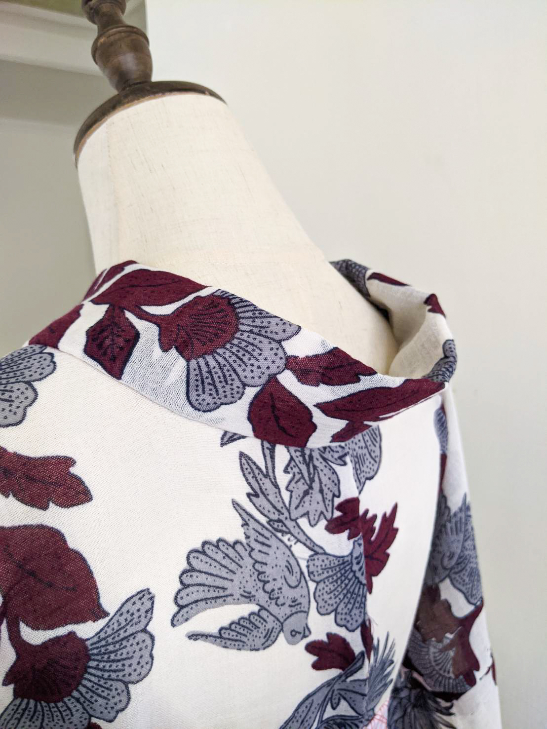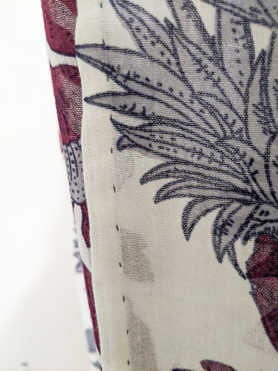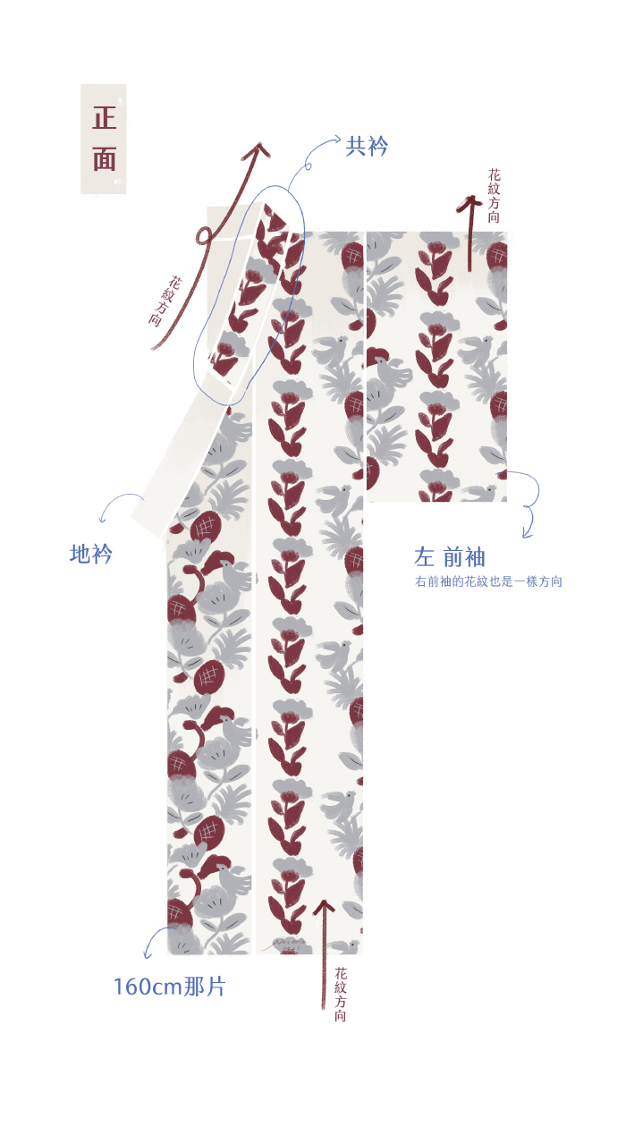 因為花紋是直紋,不是方格子,所以不用煩惱橫向對花的問題,想要對花也是可以的(但我沒打算)。直向裁切就花了點時間思考,主要花紋粗和細兩組,粗的是鳳梨、大花、鳥組成,細的是單純的花串,站遠點看第一眼會看到花串,所以裁切方式以能看見花串為優先:讓花遠離布邊。