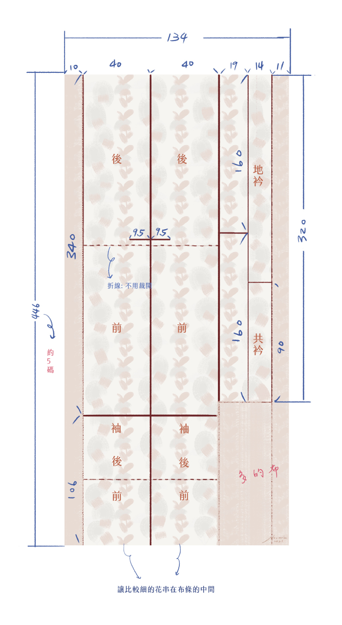 這次我先裁了布才看書,所以沒辦法照著書上的方式去排,只好我自由發揮了,以下是自由(亂)發揮(來)的花紋安排: