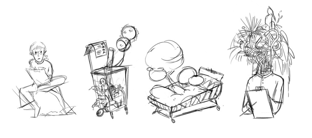 在內文往元素的方向走後,突然覺得想出草稿的過程跟去大賣場挑食材一樣,所以有了中間兩個草稿,但挑的食材有時畫到一半會發現想要的不是這個味道,就得回頭去挖別的出來,這樣我根本得把整間大賣場搬進畫裡。