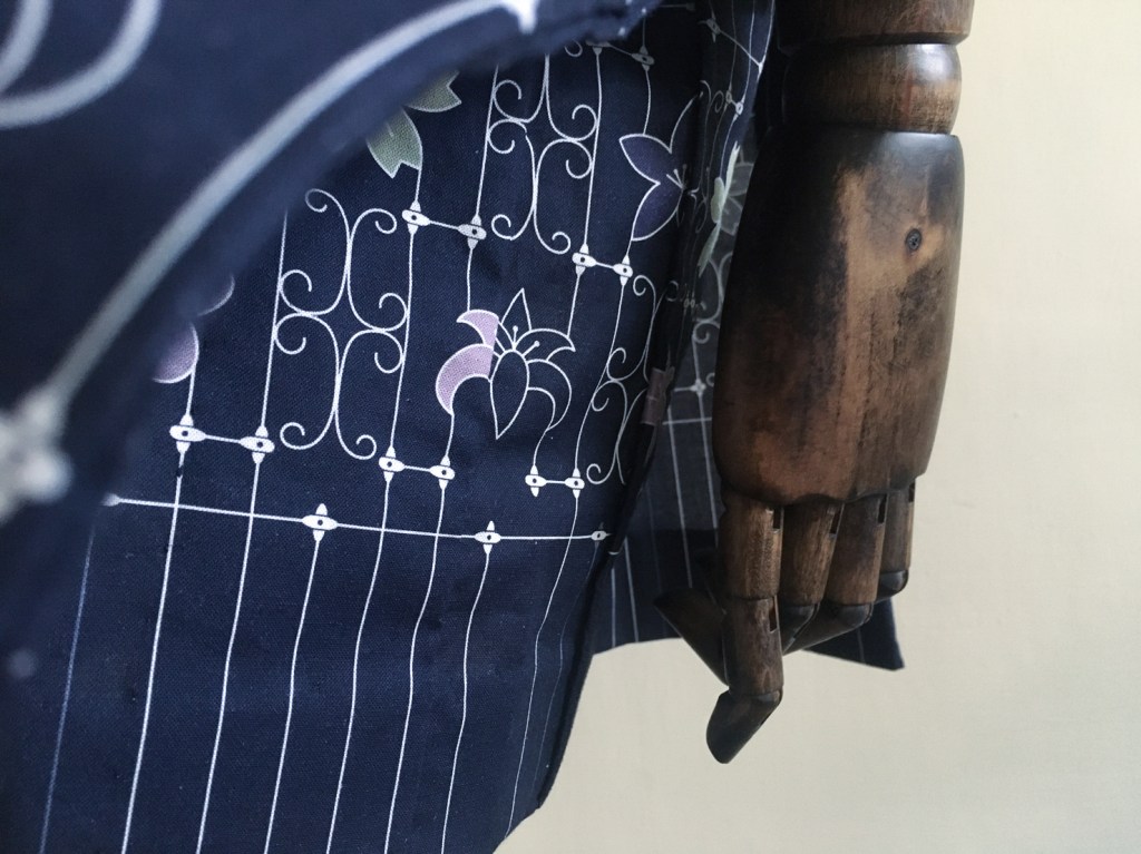 – 袖口布:在原本的羽織製作方式中,袖口布是用身體裁切下來的剩布製作,使用同區域剩布製作的還有身體側邊的側擋布,日文為 襠(まち)。想說… 難得有花紋,不對花很可惜,所以決定另外選袖口布花樣。