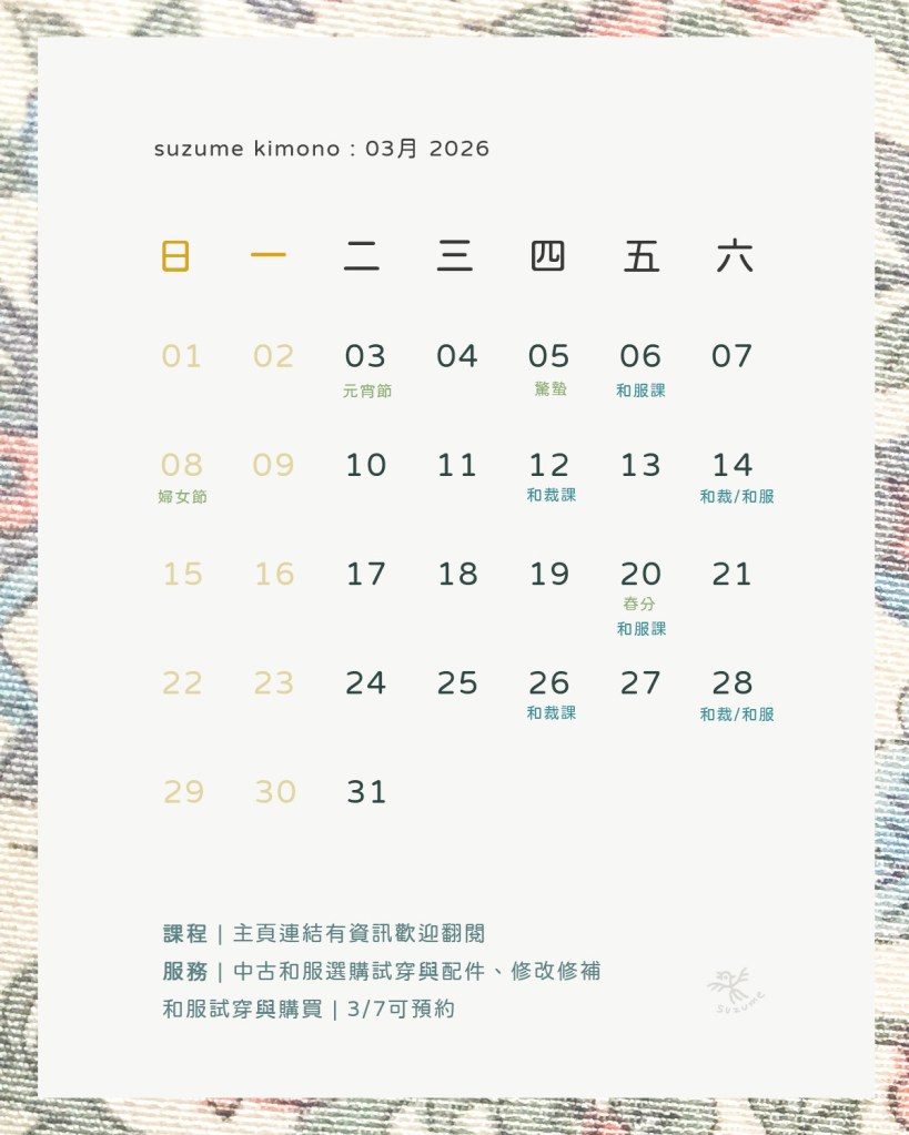 工作室行事曆 [ 課程資訊 ]和服課試水溫1堂課 ( 透過 line窗口 預約 )和裁課[ open日 ]在open日以外的時間,野雀可能不在、或是正在趕工中無法接待、或是在上課中。** 本月工作已滿,無open日,僅3/7開放預約● open以外的時間也歡迎詢問,若野雀沒有上課、時間允許,都歡迎預約來試穿和服:) 還請透過 line窗口 預約 地址資訊 分享此文: 以電子郵件將連結傳送給朋友(在新視窗中開啟) 電子郵件 分享到 Reddit(在新視窗中開啟) Reddit 分享到 LinkedIn(在新視窗中開啟) LinkedIn 在 Tumblr 上分享(在新視窗中開啟) Tumblr 分享到 X(在新視窗中開啟) X 分享到 Facebook(在新視窗中開啟) Facebook 分享到 Pinterest(在新視窗中開啟) Pinterest 分享到 Nextdoor(在新視窗中開啟) Nextdoor 喜歡 正在載入...